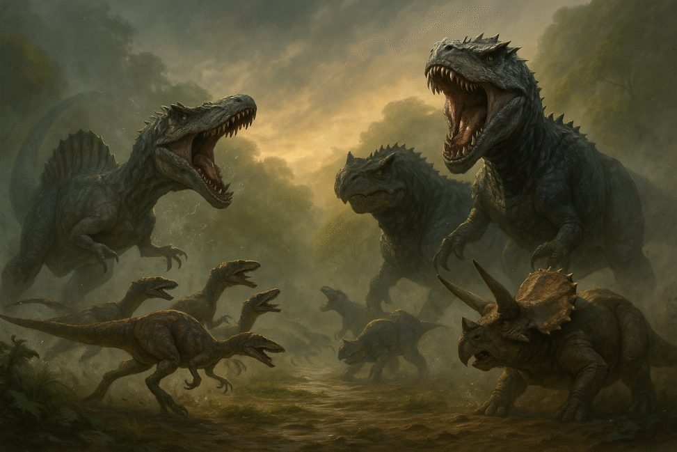 Spinozaur starł się z Indominusem na skraju rzeki. Bitwa była brutalna – ogon Spinozaura przeciął powietrze jak bicz, ale hybryda unikała ciosów z niemal ludzką przebiegłością. Złapała przeciwnika za szyję i zanurzyła go w wodzie, próbując go utopić.
