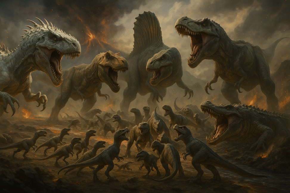 Na pękniętej ziemi starożytnego superkontynentu, pod niebem przesiąkniętym żarem wulkanicznego pyłu, czas stanął w miejscu. Dookoła wiatr rozrzucał popiół niczym zwiastun śmierci. Napięcie było niemal namacalne. Z jednej strony — czwórka najpotężniejszych bestii, z drugiej — armia zwinnych zabójców i dwóch pradawnych łowców bagien.