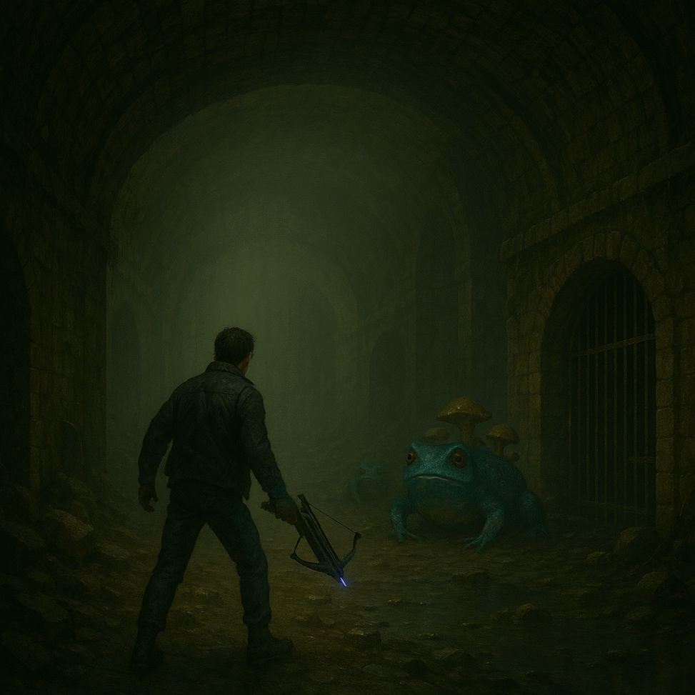 Lśniąco-fioletowa kusza, leżąca pomiędzy gruzem, resztkami plecaków i zgniłą ręką jakiegoś nieszczęśnika. Kusza nie wyglądała jak broń ludzi. Jej metal był… półżywy, pokryty dziwną, falującą fakturą przypominającą skórę żabiego boga.